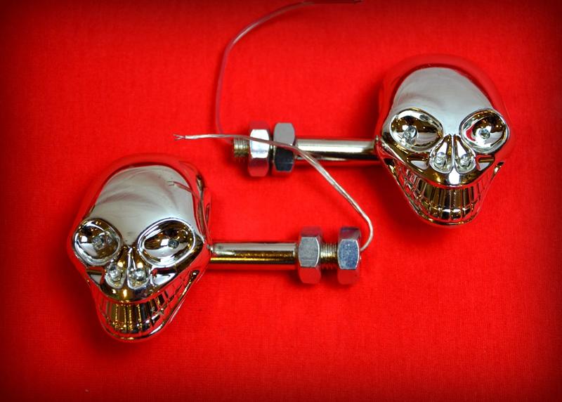 Magnifique paire de clignotants en forme de tête de mort. Ils sont en pvc et son composés de 4 diodes. Relativement facile à monter,ces clignotants attireront forcement le regard !